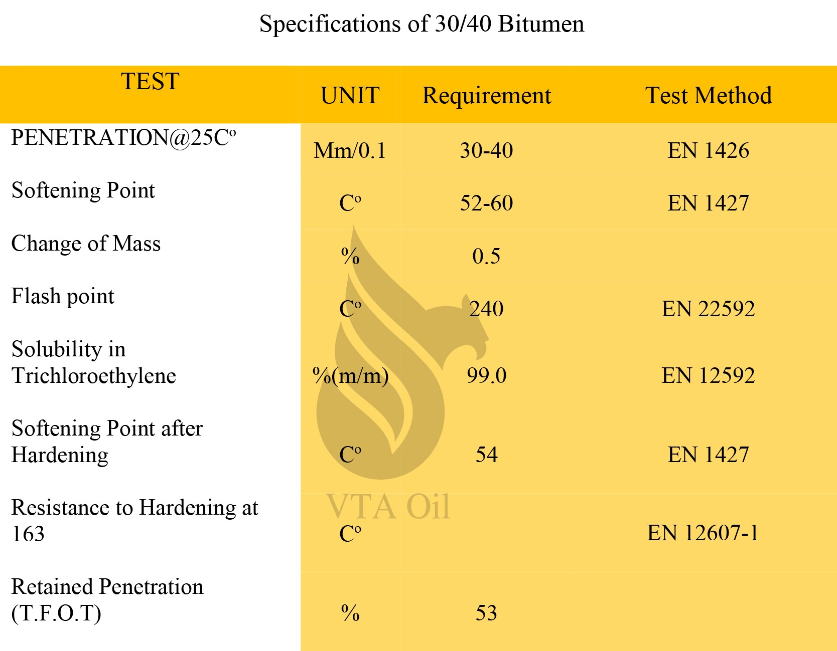 Bitumen 30/40 is a semi-hard penetration grade bitumen, commonly used in road construction and other similar applications. Here are some key characteristics: