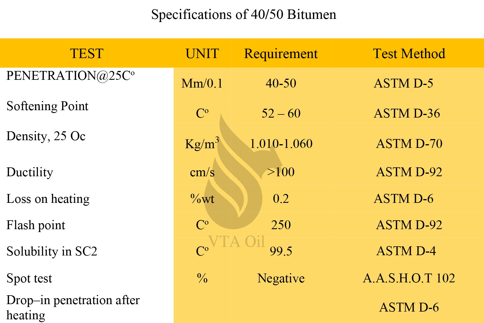 Penetration: The penetration value at 25°C is between 40 and 50 mm/10, indicating the hardness of the bitumen.