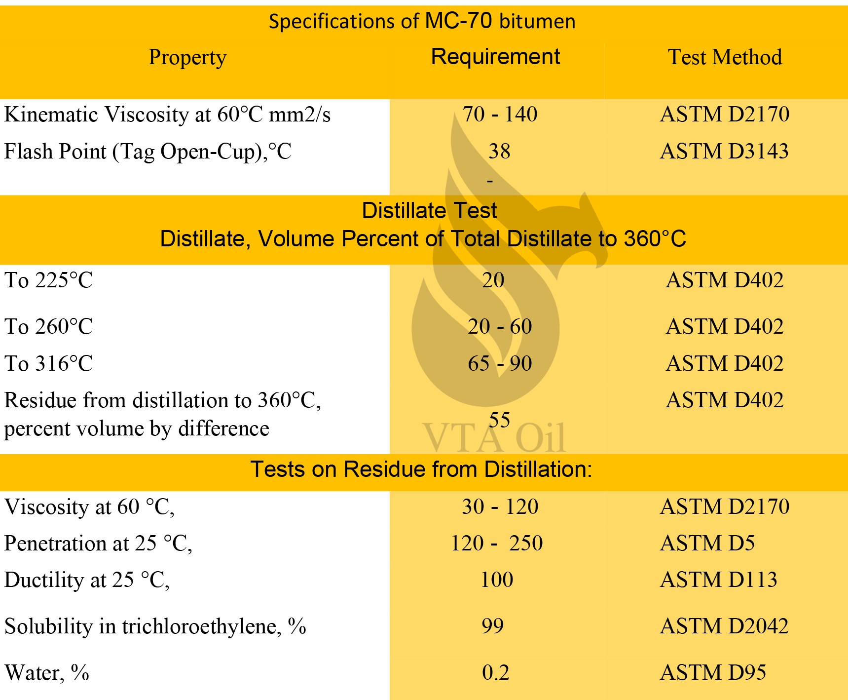 Specifications: The kinematic viscosity of MC-70 ranges from 70 to 140 mm²/s at 60 °C. It has a flash point of at least 38 °C and contains about 55% bitumen by volume.
